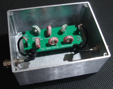 Internally, the box has a large amount of unused space. But that's an asset when dealing with high stopband levels - packing the circuit into a compact enclosure will likely create a compromise in the stopband performance. Note the coax is further decoupled with ferrites on each side. And the BNC jacks are shielded on the internal side to minimize the impedance "bump" of the connector as well as to optimize the isolation - micro level details come into play at the attenuation levels Jack's deliverying. I know from prior personal experience, to obtain the performance levels the design is capable of, the coil build must be exact. Orientation is a factor as well at these levels. Inductance levels must be trimmed to accuracy levels of under 1% and that hides the complexity of the board - it looks more simple than it is because the in-circuit value and tested values can easily have this amount of error. The only way around this is to correlate the performance and the tested values and offset accordingly. I'm uncertain what Jack's construction method is exactly - but little things like this are most certainly part of the "recipe." Advertised specifications pulled from Jack's web site are: - Filter Type: 9th order 1 dB Chebyshev.