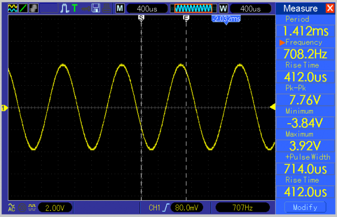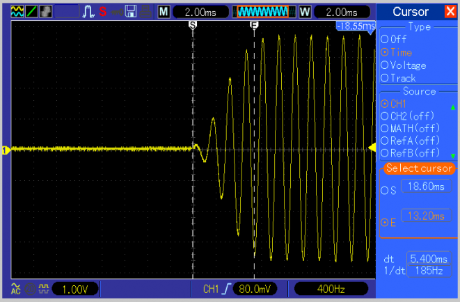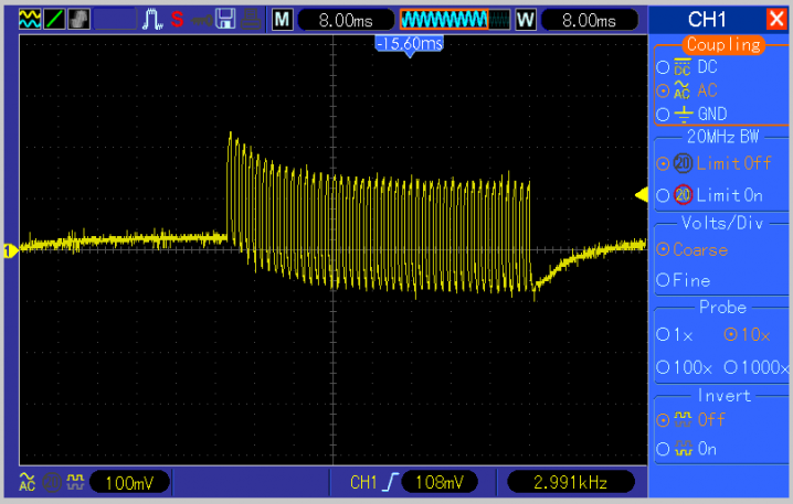 Seen below is a close up of the leading edge of the DDS chip output waveform, measuring about 5 mS. Note there is no DC offset to the 2.5V no-signal bias on either the leading and trailing edge eliminating the thump sound. The falling edge has the same 5 mS roll-off.