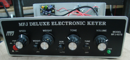 Something would have to be done and my first thought was to try to filter it. My first thought was to stick a simple LC filter on the speaker and see if a brute force method could quiet down the thump - it did to some extent (black trace below), but even with the thump muted a bit, the tone was still poor. FILTERING and the DDS "FINAL SOLUTION"The location of the spectral trouble of the keyer chip's sidetone is pretty specific - problem #1 is the relatively low frequency but massive DC offset which drives the need for low end (under 100 Hz) attenuation. And problem #2, on the high side, finds that nothing really is present until the second harmonic frequency. I prefer a sidetone of around 600-650 Hz so the 2nd harmonic is at 1200-1300 Hz. And because the source is a square wave that means the 2nd harmonic is lower in amplitude compared to the odd harmonics suggesting the next "big" amplitude peak would be at 1800 Hz. These are confirmed by the SA plot (above). So the ideal filter would whack the low end, and roll off the high, as genitally as possible to avoid impacting the rise/fall times of the individual keying element. Filtering anything passes for fun around here so my initial solution was to try the Hi-Per-Mite CW Filter; available from the Four State QRP group as a kit. The results with that were OK but not quite what I was looking for. The Hi-Per-Mite provides a nice pretty good 100-150 hz passband - but that fairly tight bandpass comes at the expense of some rounding of the impulse response of signals fed into it. The ideal keying waveform rise/fall times cannot be too fast - or it will sound "clicky." And it cannot be too slow, or it will sound "mushy." Something in about the 4 mS rise/fall time range is very nice. Generally speaking, the higher the filter Q, the more delay there is and the more aggressive the rounding of the leading and falling edge impact is. As bandpass filters go, the Hi-Per-Mite filter is a low-Q type, but it's still too aggressive for this application. I suppose the same circuit topology could be used with different values and retain the original PCB, but I wanted to see what other alternatives were available. Maybe something I had not thought of would be a better alternative? Digging around the internet I found several passive type filters using the old 88 mH telephone toroids and some other odd-ball types of filters. There are tons of active and SCF filter options available - with plenty of free for the download software that helps design that sort of thing. Unfortunately it did not look like any simple combination of active filter scenarios was going to give the tone I was hoping for. I ran across a web page by WB0RIO Forrest Cook which uses a triangle waveform oscillator feeding a voltage controlled amp and filter with a nice looking waveform. No kit or PCB was available so it would be a breadboard project. http://www.solorb.com/elect/hamcirc/sidetone/ Some comments on that circuit included modifications made by W9AC Paul Christensen. In discussing the circuit with Paul, he told me that the design worked fine and sounded good, but that he had recently switched to an audio DDS sold by N4YG that worked pretty well. http://www.n4yg.com/STCPO.html A kit generally beats breadboard at this QTH so I bought the N4YG DDS kit and it looked good on the scope - although the rise time was too long. The sound being sweet and clean but a bit mushy with higher speeds due to the slow rise/fall rate. I suppose that for learning CW that's not a problem (and that's really what the circuit was designed for) - but for any speeds from the mid 20's or higher sounded mushy by my ear. In discussing it with Joe N4YG, he was kind enough to tweak his firmware and sent me out a modified chip a week or so later. Great response!!! With the new chip; the waveform looked great! And it sounded great as well. The DDS was mounted in the MFJ on a couple of screws that were stuck in the back side of the MFJ board and serve as risers. I reused the original volume control but swapped the 1M MFJ pot for a 5K unit that comes with the DDS board. The 1M pot may have worked as the tone control, as it's just a voltage divider which provides a voltage reference that is read by the DDS ADC. The ADC has a pretty high Z input but with the MFJ disassembled, it was easy to swap the pots. I padded the pot with fixed resistors on both side to restrict the resulting tone range to cover 500-850 hz (it will cover about 200-1500 without the limits) just to improve the granularity of the pot in picking that perfect pitch for the sidetone. Also visible in the photo below is a 3-terminal 9V regulator - which allows me to feed the keyer with the shack's roughly 12v bus and not fry the Curtis chip which has a 12V absolute maximum rating. The DDS is "keyed" by tying into the driver transistor hanging off the Curtis chip's output. The DDS needs a 5V signal and so I used a MOSFET 2N7000 to serve as my level translator.