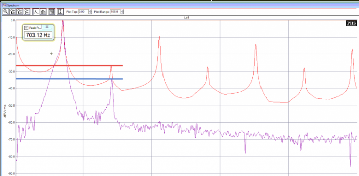 The final result of the DDS addition, comparing the original Curtis chip sidetone (red trace) with the DDS output (purple trace), is given below. There is some 2nd harmonic content present (-35 dBc) but it's about 10 db improved relative to the square wave of the Curtis chip. The higher harmonics, and importantly the near DC component, are both absent with respect to the general noise floor.