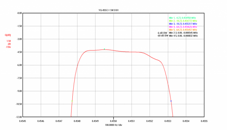 Meanwhile, back at Kenwood Hybrid HQ...I had not progressed beyond the concept of using the -1 filter in the '830s. And at about that same time a message popped up on the Kenwood Hybrid Yahoo group reflector which wiped away any remaining concerns. Chris W7JPG had published work proving this filter would in fact work - although in an indirect maner. Chris used the Collins mechanical 455 KHz filter in his setup (not the crystal one featured here) but because the Collins filter has the same CF as the crystal filter, the results would be similar. Test and check out of Chris's rig was done as part of a restore job by Terry K9TW. Click HERE to view the W7JPG/K9TW Collins Filter Install Notes There were two key conclusions from Chris and Terry's work applicable here. 1) A 455.0 KHz CF filter works as intended in the TS-830s, provided 2) the IF shift control is rotated to about the 9:00 position (which compensates for the CF difference). Why use the crystal vs. the Collins mechanical option? The Collins filter is a very suitable alternative to the YG-455C-1 crystal filter and has had wide adoption in ham gear for decades. It is a bit lower in cost (at that time) and I had considered the option, but decided to proceed with the crystal filter instead because the shape factor would be better thanks to a combination of less filter blow-by and steeper transition band skirts. Additionally, the installation would be simpler as it's a direct mechanical fit with the mounting holes and it would look just like the stock filter. YG-455C-1 Bench Characterization