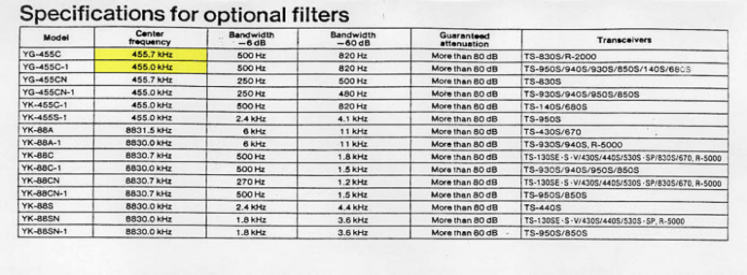 455 KHz 500 Hz crystal filtering on a relative budget The YG-455C 2nd IF filter built for the TS-830s series is rare and as a result, expensive. However the YG-455C-1 is much more common as it was used in may newer Kenwood rigs. Being more plentiful it is (by comparison at least) more affordable. Here we put the repurposed YG-455C-1 to the test. Filter OptionsThanks to N6WK (SK) we can see the specifications of the various Hybrid family rigs in the table below.