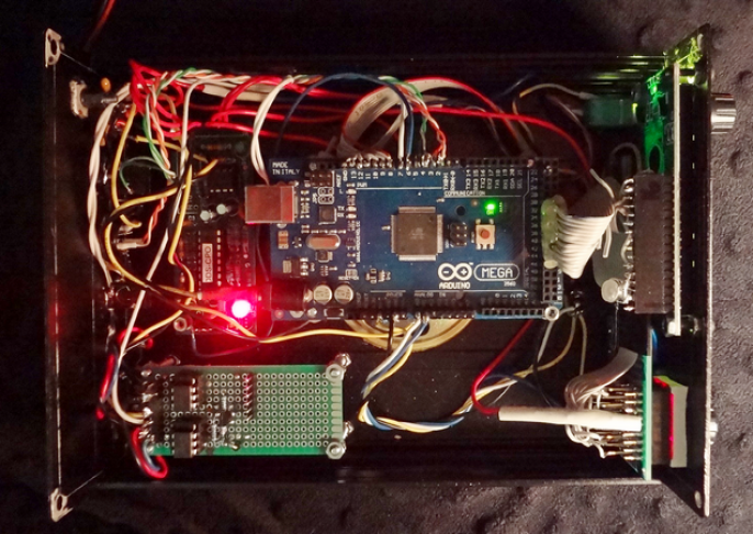 The external speaker and key line jacks were hot-glued to the PCB. The two blue buttons allow speed adjustment up/down in 1-WPM increments. A PS2 keyboard jack hangs off an attached dongle allowing full access to the keyer's menu settings - or for the sending of keyboard-based CW. The keyer has a type-ahead buffer and a lot of other slick features. It's built around the Atmel ATMega328 uP which is used in a lot of Arduino chips. The source code in C is published as well but it is a Atmel Studio based project, not an Arduino implementation. Advantages of this keyer were an assumption that the timing considerations (if any existed) were well nailed down by CW pros and that the keyer feel would be excellent. Disadvantages were the junkbox dive needed to find parts and if the code was to be modified later, my lack of experience with the Atmel Studio platform. The missing DDS function could be handled by an outboard DDS. K3NG ARDUINO KEYER