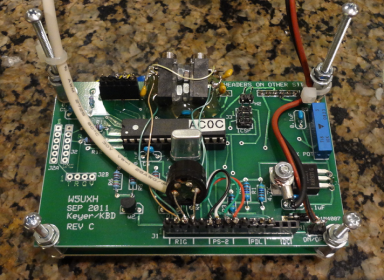 AE9RB IAMBINO http://ae9rb.com/ This is an interesting kit built as a shield that sits on top of the Arduino board. Features include code playback memory, a DDS chip for sidetone generation and an LCD which includes speed. The assembled unit is compact and would make a great travel keyer with a built in speaker as well as a headphone jack. Speed adjustment is done by a pot; other settings are configured by a menu system built around the 5 buttons below the display. Everything on this board worked just as it should have and the construction + programming was simple. It comes in kit form so you only need to separately source the Arduino - no deep dives into the junkbox required. There are some trade-offs compared to a full size keyer with dedicated boards as used in the MFJ mod. DDS tone purity is compromised by noise from the digital circuitry that surrounds it and is really noticable with headphone use, especially when the display is dimmed. Setting the display to off or 100% bright minimizes that effect. On the other hand, sound quality is much better than a square wave driven device of course and for the most part, sidetone on other projects is in the beeper category. W5UXH KEYBOARD + PADDLE KEYER http://qrqcwnet.ning.com/profile/ChuckBroadwellW5UXH