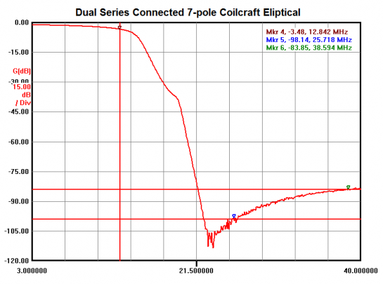 VNA plots of the filter module look like this. For transmission attenuation, with fundamental, F2 and F3 marked. Suppression of -95dbc down on the 2nd and -81 dbc down on the 3rd harmonic: