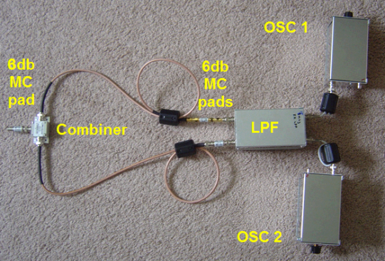 The combiner MC ZFAC-2-6+ measures right at 32db on our output frequency. So the overall system with oscillators, pads, LPF module and combiner looks like this: