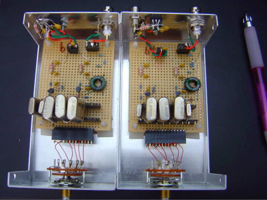 Building a Cleaner 2-tone IMDDR3 Test SourceWith the external modifications, the unofficial estimates of IMD3 from the Dual Si570 based RF generator were about -90 to -95 dbc. I really worried that that was not enough. We were measuring 8x-9x db ranges on the FT-2000 filter project and that means the target signal purity coming from the test source really needed to be about -10dbc better than our best-case measurement. So the new threshold requirement was really something in the -110 dbc range. The only way to do that is with linear elements - either L/C or crystal. L/C is not stable enough without special circuitry and so building a crystal unit was the next step. After hunting around, it looked like the most documented oscillator design was the Wentzel which pulls the signal off the cold end of the crystal, essentially filtering the oscillator products through the crystal itself, and leading into a FET buffer to provide drive and further isolation. Here: http://www.wenzel.com/pdffiles1/pdfs/xtalosc.pdf Jeff Smith VE1ZAC used that same design to test his IC-7700 and rendered final results that matched the ARRL's high 90's DR3 number quite well. His story is found here: http://www3.ns.sympatico.ca/jhsmith/myweb4/Part%202%20IMDR.htm And Adam Farson VA7OJ documented his build using the same PCB layout with a slight mod to accomidate slightly different crystals. The 2nd/3rd harmonics were about -50dbc and the IMD products unmeasureable - and all that was without further filtering. I became convinced this design was the way to go. Bill Carver W7AAZ suggest replacing the FET buffer with a grounded base transistor to further increase linearity. I had resisted using a crystal solution because there is no initial provision to change frequency. However, while at Dayton, I ran across a vendor and purchased about 1000 crystals in the 12.xx Mhz range. That opened up the possiblity that, with some bench work, a combination of mix and match would provide for a wide spread of frequency spacing combinations.  That worked out exceptionally well. Crystals were graded by output and frequency level (without "pulling"). And then by selecting crystals of similar amplitude and with the proper needed frequency, the oscillator is able to run without further frequency manipulation.