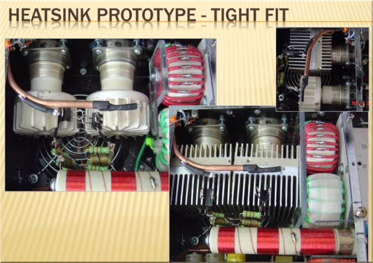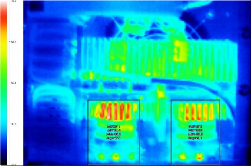 By far the most cool test gadget I have ever used is the IR camera. It provides James Bond style heat signature pictures, along with a very specific temperature reading at every point in the photo. In this picutre we can see the enlarged heat sinks are keeping the tubes much cooler - almost 80C lower. A very valuable benefit of this is that it was the first point where I noticed that the toroid on 40m was heating significantly. Subsequent checking showed temps over 100C.
