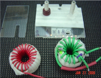 Toroids for 40/80/160mThe 160m (red winding) is dedicated for 160m. And the green winding is for 40/80m. The mounts allow a good fit to ceramic standoffs. And the high-temp teflon tape helps to give a bit of heat protection to the soft PS and keeps the toroids tightly fit on the standoffs. The balance of the tank is implemented in copper. Performance on 20m and 80m is exceptional. Other bands good and poor on 40m. The Q is in the 8-10 range on all bands - and I suspect the shared ferrite is the problem on 40m. And the Q is in fact higher than 8-10 on the higher bands due to the stray cap (higher C means lower L and the ratio relates to the tank's Q).