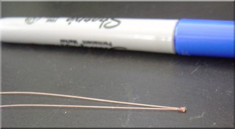 The thermistor (left below) is rated at 300C max. It's very tiny. The thermistor is routed out of the transistor via these 2 small red wires.