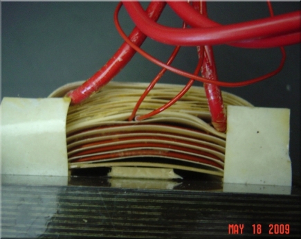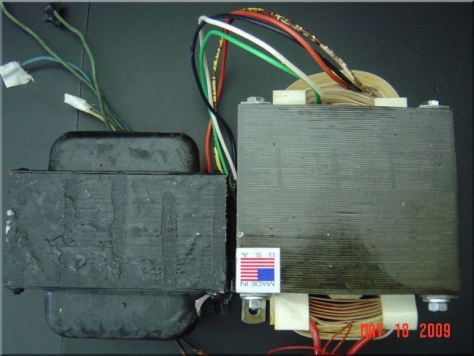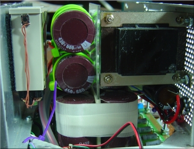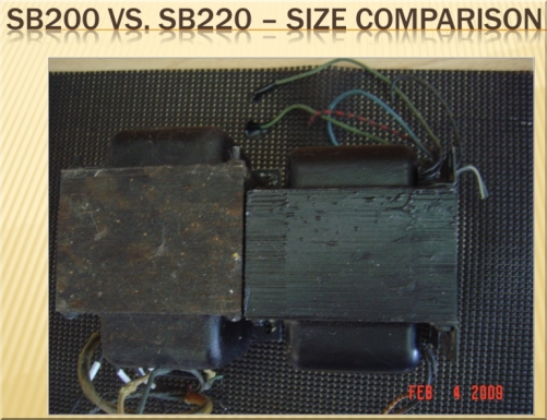 The power supply module is fully removable (picture at right). HV runs are insulated with plastic piping. The original design of the Harbaugh board supported 6 caps but given the higher voltages this amp runs at, a total of 8 450v caps is used. 0.1% 3W precision bleeders are put across each cap to help keep the cap voltage values even. Transformer Replacement - Plan AInitially, the target Sleeper transformer was going to be the SB220. It's slightly larger in size and has quite a big higher B+ idle voltage (2500 vs. 3100v). The stock SB200 transformer was very sturdy and showed only minimal heating in the difficult bench testing done prior to moving to this transformer. Hopes were high that we would be able to get the similar performance at a higher voltage from this SB220 transformer.
