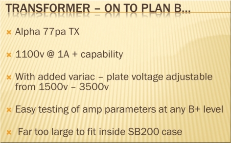 I did not have handy a 220v variac so I tied the 120v variac into one side of the power line. This allowed varying the B+ level applied to the SB200 to range from about 1800-3200v. A fan over the variac was added just for good measure. The Alpha 77ap transformer on the other hand needed no cooling. That is a MASSIVE transformer weighing about 45 lbs.