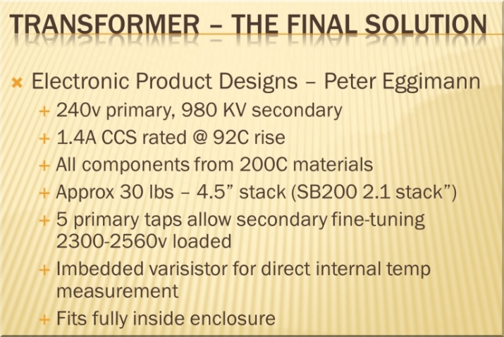 After a lot of testing of the SB200 at various voltages, I decided that a custom transformer would be the ideal solution. Eventually I found Peter Eggimann at Electronic Product Designs. Peter immediately understood the problem and was very helpful in finding the solution. Working with Peter over the span of a couple of weeks, a design came together that looked very good toward the target specifications. The amount of power that is demanded from the amp is about 1.4KW at RTTY cycle. That cooresponds to a sustained 0.7A output level from the doubler at voltage ranges of 2300-2900V idle. All the objectives of the design were realized. And EPD was even able to embed a thermistor between the primary and seconadary which opens the door to real-time monitoring of the transformers INTERNAL temperature. Measuring the external temp of the transformer is posssible but due to the high thermal mass of the iron structure, it takes a long time to get a reading at all - and that reading is much different than the actual internal transformer temperature.
