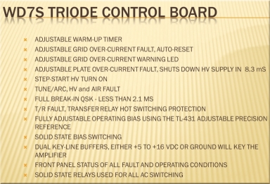 Before I was RTTY-crazy, I was CW-crazy. And having played with full break-in QSK, I wanted to ensure the new amp had the capability to support this feature. While it's possible to build your own circuitry for controlling the various amp's functions and providing protection, there are two boards on the market that make this a comparative easy project. GM3SEK has a board which provides the similar features as the WD7S offering with a couple of differences. The WD7S board provides explicit support for QSK, it has an LED output for each of the various fault conditions, and the board is physically smaller. It was for those reasons that I opted to use the WD7S board. A complete set of the WD7S TCB features is shown below.