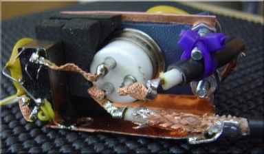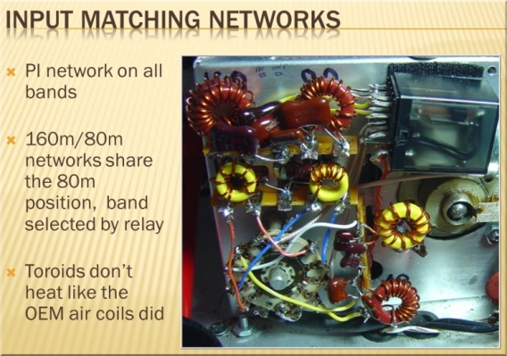 The QSK feature implemented in the WD7S system follows a similar design style as Richard Measures speed-up overvoltage circuit. I've not tested the circuit but WD7S has documentation on his web site showing effective speeds of only a few mS. The mounting shown here with the foam is part of my attemps to deaden the sound. The vaccum relay is quite loud and is suspended by the foam block - held at each end by the copper frame. Sound can also be transmitted along the interconnecting wires hence the use of the copper braid. Wires were kept as short as possible. The connection from the amp-out to the So239 is made with RG-8X. I've had zero problems with this implementation and is very quiet in operation. I beleive with the chassis case on the unit, the relay may be unaudiable even with the fan at idle speeds. Input Matching NetThe input match is provided by pi-networks. The excellent PI-EL program helped to get me into the right ballpark. And then the L/C values were fine-tuned for best overall amp efficiency and input match. The relay at the right switches the 80m bandswitch wafer segment between the 80m and 160m input match net. I chose the toroids over the stock network because I observed excessive heating in the L/C which I beleive is related to excessive Q. It was easier in the end just to put in the toroids which seem to be very robust and don't heat at all even under sustained key down. It is interesting to note that the input matching net has a HUGE effect on amp efficiency - up to perhaps 15% in some cases - far beyond what I can explain. What is puzzling is that the input matching network's impact on amp efficiency is far more sensitive than the actual match to the rig. It was easy to get a good SWR match to the rig, but the trick was fine tuning the input for both max efficiency of the amp and a good match to the rig at the same time. My advice to any Gi7b amp builder - be sure to allocate time to adjusting the input matching network looking not only at the input match but also on the amp efficiency. It's time well spent. When I later replace the tank, I will be able to bring a more scientific approach to this input matching as I have a VNA now and the MFJ259 is repaired from "somehow" getting the input diodes blown :) Should be interesting!