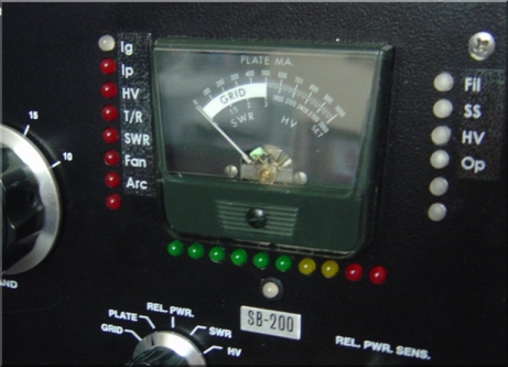 T A couple of the LEDs remain unassigned. Fault functions are aligned on the left - with the grid LED having a dual-color mode (yellow warning, red for fault). The right side of the panel is all blue in color. So in "normal" operation, the right side LEDs will all be blue and the left side will be unlit. The LED above the SB-200 label is the enable (green)/standby (blue) /transmit (red) tri-color LED. Labeling was done with a Brother label maker - many color options are available including white on clear which was the chice for this project. Build advice - determine in advance what the LED intensity level should be for your projets. I had not considered this initially and found that the intensity levels set on the bench (against a brightly lit workspace) were entirely too bright when moved over to the shack bench. The new high-intensity blue LED are especially "eye catching." Shown below (left) is the backside of the amp instrumentation. At the top of the picture is the LM3914 bar graph board. The board is held in place by velcro allowing easy removal of the board and does not require additional screws to be put into the faceplate. The left and right small boards hold the amp fault and status LED and are also removable. And at center is the meter backlight board. Take note of the huge diodes over the meter - replacement meter movements are hard to find for these old amps and a couple of back-to-back beefy diodes prevents just about any kind of damage that could possibly be applied. See more comments on this subject further down the page.