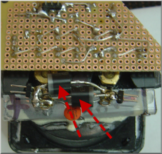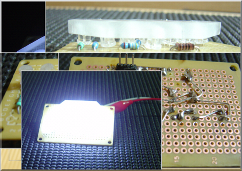 The module mounted to the back side of the front panel multi-function analog meter is a white backlight source. I could not find a "light bar" of the proper dimensions and constructed this one instead. The LEDs are filed flat and countersunk into the plastic. A "fog" colored pain was applied to provide further diffusion of the light. The cutouts allow the meter to sit over the terminals and just above the production diodes. A foam surround wraps over the top of the meter to increase the contrast by suppressing light that would project upward through the top of the case. The overall visual result is excellent.