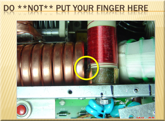 Lesson 2 - Make sure the power supply is really off and bleed down fully before proceeding I'm not sure what I was doing that day. Not paying attention, most certainly. Managed to stick my finger between the B+ line at the input side of the plate choke and the input side of the pi network. Enough current flowed between those two points to blow both the amp's breakers and pop the HV fuse indicating a full discharge of the filter caps through my fingertip. The skin was charred slightly in 2 spots but otherwise, no damage done. Be careful where you put your fingers...