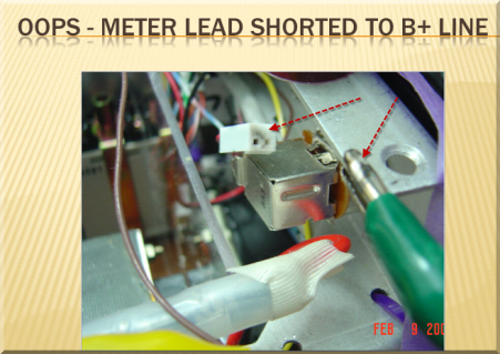 But then again - is an amplifier project really ever "fully complete?" ============================================================================================================== The School of Hard Knocks - A Couple of Important Lessons Learned The high voltages exposed in an amplifier can kill you. But for some people at lesson seems a hard one to learn. I got two lessons for free, to help remind me of the dangers. I'm much more cautious now. And very thankful that the amp and my body survived both lessons... Lesson 1 - protection diodes are NOT optional A dozen or so diodes applied at the right point in the amp can save a lot of hardware from distruction. And if you are going to put in a diode, use a big one - meaning one that has a high surge current rating. You just never know what kind of accidents or trouble waits down the road. For example, let's say you are probing the high voltage line searching for the source of why one of the filter caps keeps exploding. And for some reason you have been too lazy to actually cut the lead to the bleeder resistor so you can measure it seperately. You instead have been clipping on bleeder resistors thinking if the original bleeder is open, this would fix the probem. And then, oops, the clip comes off one end of the cap and falls - down - onto - the - analog - meter. What are the odds of that? Happened to me. Fortunately I had put the insurance (back-to-back diodes) onto the back of the meter and other than some momentary fireworks, no damage was done.
