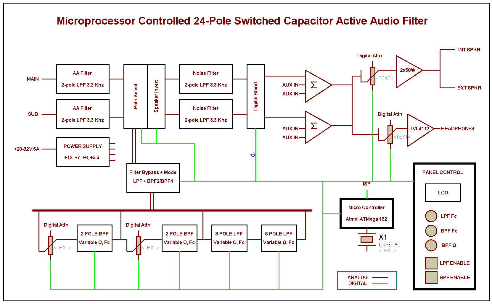 This project is an extension of two projects - first is the work on adding an APF-type high-Q bandpass feature to the 2nd RX of the FT-2000. More on that project may be found by CLICKING HERE. And the second driver is the memory of the fun I had as a kid with active filters. DSP vs. AnalogAn active audio filter is in many ways comparable to the digital variety without the complexity. It has the performance and flexibility advantages without the need for specialized DSP hardware or coding implementations. There are two areas that the DSP is superior - in current rig implementations, the DSP filter is typically part of the AGC loop where a back-end AF only filter is not. In addition, the ringing performance of the DSP can be better than the analog variety at the expense of higher demands on DSP hardware. Something More Extreme - A Microprocessor Controlled Deluxe Filter? If any active filter project can be called a Beast, it's possibly this one. Based on the Maxim MAX262 universal 4-pole switched capacitor filter (SCF) to provide the BPF function. That is followed by a pair of MAX7400 8-pole elliptical response LPF modules. These filters are adjustable for performance like cutoff frequency and (in the BPF filter case) Q. Total pole count here is 24. In addition, fixed LPFs on the input, output and amplification modules add an additional 6 poles of noise rejection roll off. 15 IC total. Topology and Circuit DescriptionThe design objectives were to allow for maximum flexibility of settings. The disadvantage of traditional fixed active filters are that their performance is not adjustable. Yet often times, band conditions would allow for a different Q or center frequency setting and with a fixed filter, that is not possible. The low end filtering was not considered because the 1K-mod combined with the IF shift on the 2nd RX allows for the similar steep roll-off on an adjustable basis. In addition, the impact of the group delay (which is realized as ringing) is much harder to address in the active AF filter. So low end roll off was gradual and just enough to help ensure some attenuation of possible 60 hz hum. Here, thanks to the Maxim Switched Capacitor Filter (SCF) ICs, a micro-controller (Atmel AVR running at 11.125 MHz) provides the ultimate in flexibility. It drives an LCD display allowing for convenient indication of the filter settings. The two BPF filter modules within the MAX262 are individually programmable and with separate clocking to set the center frequency of the following LPF elliptical as well. As a result, an infinite variety of BPF filter response implementations are possible - all adjustable by firmware. The LPF is only adjustable at the cutoff frequency - however, by changing the socketed LPF filter IC, bessel, butterworth, elliptical R1.2 or elliptical R1.5 variations are possible. At the input of the signal chain are AA filters. The sample frequency of the filter is about 100x the signal frequency so anti-alias filtering is not needed. However, I wanted to keep the high frequency noise out of the signal path at the start. The AA filters are a low Q butterworth design and provide about 12db of gain in the process. The reason for the gain is that the noise floor of the SCF is fixed - so by pushing the signal strength up prior to these stages, the SNR is increased. The gain of the BPF modules is equal to the Q. Which means in the case of a Q=8 (as the APF filter design would require), an input signal of 1V would require an output swing of 8V. The filters are fed with a 6V signal to maintain logic compatibility with the MCU and that would mean clipping - certainly a bad thing. To avoid saturation of the BPF output under high Q conditions, digital pots prior to each stage allow for a preemptive gain reduction keeping peak voltage swings in check. Two additional digital pots prior to each output path (to the speaker amp and headphone amps) allow for individual gain setting.and leveling regardless of the headphone or speakers used. Following the SCF BPF/LPF modules are the noise filters - these are low Q unity gain LPF 2-pole stages which buffer the 10K output of the SCF and drive the digital blend circuit. The noise filters ensure there are no SCF noise artifacts present in the signal and the low Z output ensures the rest of the circuit sees a consistent supply Z. The digital blend circuit allows mixing of the channel 1 and channel 2 inputs if the operator were to prefer not to have a one channel per ear operation method. Each signal path has it's own blend control, so for example, the main can be shared while the sub can remain isolated. The amount of blend is adjustable from 0 (isolated) to 100% (sound levels equal from both speakers). Click on the topology graph for a high resolution view.