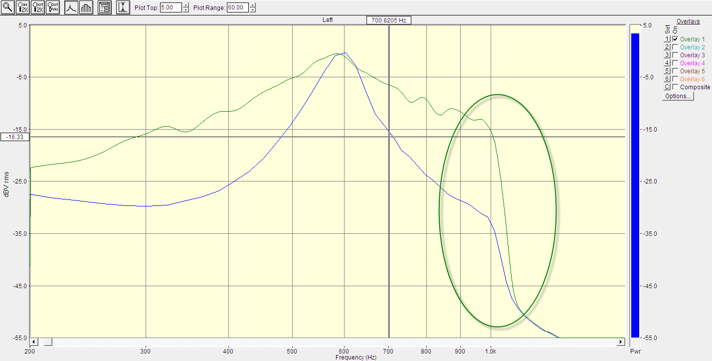 The effect of the BPF and LPF filters can be seen here in this 20-20KHz wide frequency plot. The LPF cutoff is set to 1000 hz in this example. Center frequency of the BPF is 600 hz.