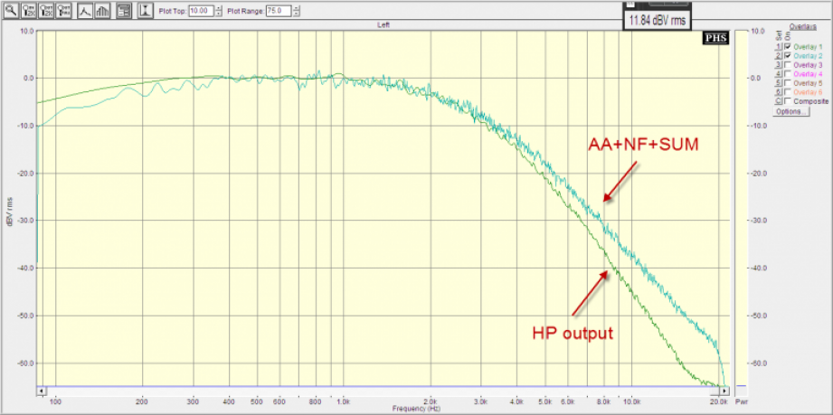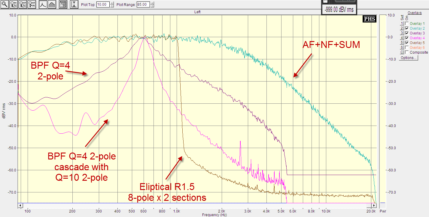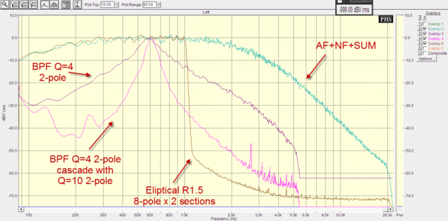 The filter board sits atop the separate 100W speaker amp module (CLICK HERE FOR MORE ON THE AMP MODS) and is mounted in the box toward the back. This location provides the max cavity dimension between the speaker and the board for batting. This speaker is really a good unit for communications but the enclosure must have a damping material or the standing wave generated from reflections off the back wall can drive a guy nuts in CW/RTTY operation. The DC power input goes through a big 2mH power choke with 0.1 on each side for a LPF PI net action. On the amp side is a 47K uF cap to ensure the amp has plenty of local reserves just in case the external 19.5 4.75A power supply is not quite ready on a RMS basis to keep up with the amp’s peak demands. In any event, with 50W + 50W – the house should rock with RTTY and CW at just any volume you want… The headphone amp is also well-heeled. The output drives 500 mA peak output per channel and will swing rail to rail 7V into 2 ohms. I’m not sure what the limiting factor is but with the headphones I had tried today, my ears gave out far before the amp ran out of drive… That’s got to be at least a couple of watts per channel – compare that with the usual 100mW headphone amp. Beef should be served by the pound increment and headphone amps should come in watt increments, not mW. The external speaker outputs float above ground and to put the hells hammer on any RFI from that speaker line which will be long, there is a big type 31 ferrite with something like 12 or 15 turns of 178 wrapped around it. I’m sure K9YC would find it satisfactory. Input lines have 0.1 across the input and a 470uH choke in line. This is more of a RFI prevention measure than any attempt to add more LPF action. The filter board has plenty of that. I will graph the effect of this net sometime to make sure it's not otherwise effecting the overall response. Plugging the phones in pushes a hard-mute on the speaker amplifier module so there’s no beeping or squeaking from the loudspeakers with running cans. If you have experienced the bump-bump-bump sound typical powered loudspeakers produce at transmit, you will understand this feature. Initial Operation TestsAfter debugging the hardware, and making a basic firmware capability, I could test the overall frequency response of the filter and see how it performed vs. the design objectives. The overall response of the unit looks like this. This graph is with white noise feed into the system input, and with the spectrum analyzer connected to the output just prior to the speaker/headphone amps. The slight additional roll off in the HP output (the speaker amp is similar) reflects the LPF filtering that was added to that stage.