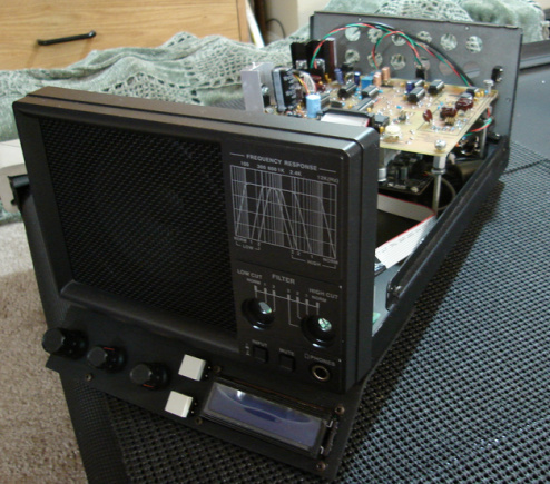 The enclosure for the project is the Yaesu FT-2000 companion speaker SP-2000. In the stock orientation, it has some LPF and HPF capabilities that are performed on a passive basis. All of these items were removed in the mod process. I never did find a use for those two original rotary switches so I guess they will just sit there and look pretty. I used up every single IO port on that chip and so I can’t use these for quick preset or something like that. Hmmmm…. Now if I were to hang a port expander off this CPU, that would give me an extra 16 I/O lines and I could add a lot more knobs, buttons and switches!!! The filter's control section (above, right) was built onto a Lexan face that extends below the front plane of the speaker and at a tilt thus avoiding modifications to the stock speaker facing. The reason for this was practical; I could not find a way to mount the controls on the existing surface where it would look nice. The stock 1/2 input switch now defines which of the two “paths” the filter is in so I can use the filter with either the main or the sub RX. The AA/NF and other 3 kHz BW filtering (8 poles of LPF total) is fully time on both paths. So only the BPF and elliptical LPF module flips from one side to the other. The mute switch flips the feed between the two speakers (one internal, one external). Normally I would run the main into this speaker and the sub to an external speaker. The mute switch will let me reverse these two because the external speaker is not as ideally located near my head as the main speaker in this box is. I will label the front panel when the code is a bit more worked out. That’s one of the cool things about the AVR doing the interface work – you can determine the functionality of the controls later as it’s not hard-wired for one certain way… Presently the two gray colored push buttons enable/disable the LPF or BPF filters. Rotary controls set LPF frequency, BPF frequency and BPF Q. Each of the rotary switches have a push button built in which are tied to additional functions. All of these The ribbon cable pokes out of a relief cut into the Lexan/steel. Interestingly – the screws that some guys though were uncosmetic turned out to serve a very good functional use. The bend angle is just right so that the screw touches the desk surface. When pushing the rotary encoder switches, the Lexan flexes and gives a fuzzy feeling to operation. I noticed there was none of this near the LCD (it had 2 screws already) and so I added a 3rd screw on the left. Now the force of the push on the encoders is absorbed by the screw contact with the desk. I will have to remember to put a bit of something on the bottoms of those screws to avoid scratching my precious desk. Actually, the ideal solution would be to find some encoders that had a lighter touch on the center push button, did not have detents but did have some “drag” when you turned them and also had thread-mounts and kerneled shafts. But I have been looking high and low and it seems that beast just does not seem to exist at least that I’ve found.