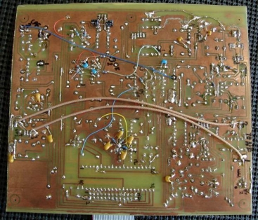 Rob K0RU was kind enough to do the layout for me and build the PCB - I really appreciate his hard work as this project has grown into a level of complexity that I had not anticipated. Doing it on a breadboard would have been a nightmare.The prototype's PCB is double sided. Vias are manually plugged with wire or components soldered on both sides. The PCB should have turned out better but the film I used was old and the effect was poor trace printing. Other than aesthetics, board looks like it will be functional so the decision was made to push on - knowing that there would eventually be further modifications and likely an additional board would be built. That really turned out to be the case as many of the circuit details were adjusted based on the prototype's bench performance. Quite a few details were overlooked in the design (primarily DC biasing of the capacitive coupled stages) and these were discovered and fixed on the bench when testing the prototype.