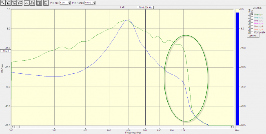Zooming into a tighter range of 200 - 1500 hz span, we can see the effect of the HPF roll-off. -46 db down at Fc+100 hz. Performance on par with the rig's DSP. The low end is not considered because the 1K-mod combined with the IF shift on the 2nd RX allows for the similar steep roll-off on an adjustable basis.  In this graph we can see the combinational effect of the two filters used together (the BPF and LPF). From this graph it's easy to see that adjustments in the Q of the BPF, and in the Fo of the LPF, will allow the shape and the roll off to of this filter combination to exactly match the main rig's DSP APF (the low end is contained by the rig's 2nd IF filter). In that sense, one of the project goals of providing a 2nd RX APF feature that matches the main is realized.