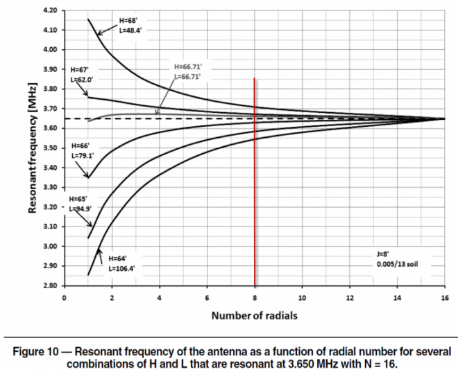 If currents can be made identical (!), then a few (4) radials are enough to provide good service. However, the more radials, the less important is the need for uniformity . Given the land has a bit of a slope and uniform radial spacing was hard to get exact, I thought 8 would be a fine choice. There is a graph in the N6LF QEX article which helps estimate the impact of radial count vs. resonant frequency as a proxy of influence (below). This graph shows a convergence starting around 4 radials and reaches it's peak utility at around 12 radials. 8 radials as a minimum seemed to be a good compromise choice.