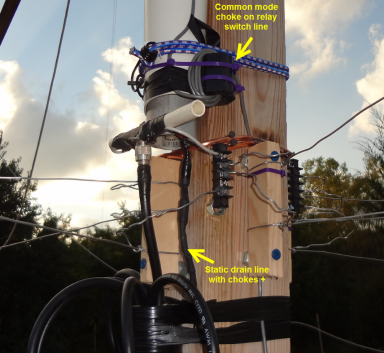 Shown here are the common mode choke for the relay switching line (top arrow). It measures about 5K ohms on both 160 and 80m. Below that, in the black heat-shrink tubing (lower arrow) are the static drain chokes (2x 250 uH) and resistors (2x 2.7 K). The resistors are too low in value but that's what was in the junk box on hand. I'll have to change them to something bigger later. The other end of the resistor is tied to a wire running down the support post, and connects to a 4' ground rod driven in at the base. I had not fully appreciated the static build-up until I happened to pick up the relay wires a few days prior, just as a storm was coming into the area. I can say without any reservation that the wire tested positive for high-voltage according to the nerves on my hand!