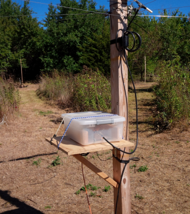 The L/C matching network is housed in this plastic tub. Bungees keep it from being blown off the support in the wind. The elevated radials do not have a ground connection here at the vertical, but do see an earth connection at the 2x6 switch by the tower, on the other end of the RG11 run.
