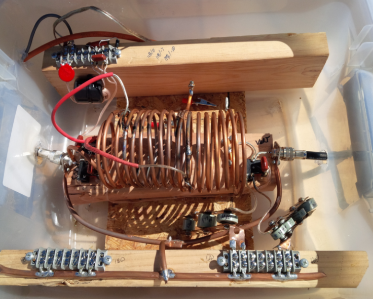 The output of the L/C net runs through another common mode choke wrapped this time on RG-11. From here it's about 300' distance to the 2x6 switch located at the base of the HF tower. The band switch control line can be seen here (orange wire). It's direct-burial RG6 which I had on hand. The relay and L/C net draw about 100 mA @ 24V each. With 24V at the shack on the control line, there's about a 4V drop to the L/C net. The relays need about 15V minimum to pull in. The L/C Network and MatchingThe vertical is naturally resonant at about 1720 KHz (relay engaged) and 3400 KHz (relay disengaged), resulting in vertical feed point values at resonance of about 32 ohms (80m) and 14 ohms (160m). The lower value on 160m is due to the short physical height of the vertical. While the cap hats address the reactive part of the resonance, they do not do much for the resistive component. The short jumper running from the vertical, through the common mode choke, and down to the L/C network presents vertical-side termination values as follows: 1.825 MHz 19R/+54j 3.600 MHz 87R/+52j I was quite surprised that such a short run of coax (about 14'?) could cause such a big change in the antenna feedpoint! The job of the L/C network in this antenna is to provide a match into the 50 ohm line at the 2x6 switch. It's important to note that the RG-11 run is part of the overall matching network system. The traditional approach is to match the vertical feedpoint value to the 75 ohm coax (75R/0j), and then put another 75->50 ohm match at the 2x6 switch where it joins up with the RG213. In this case, I have skipped this 2-part step and instead built the L/C to provide a 50 ohms match at the end of the RG-11 run where it meets the 2x6 switch. For example, if you have 51R/+19j (on 3.6 MHz) from the L/C network feeding into this particular length of RG-11, you will measure exactly 50R/0j at the other end of the RG-11! The RG-11 was measured by a VNA with a 50 ohm load on the other end. And then the L/C network was constructed with initial values set to match those measured by the VNA. Final adjustment was then made by placing the VNA at the 2x6 end of the RG-11, and trimming the L/C values to give best. While this provides a great result, it requires either a VNA-reading helper to report findings to you (which I did not have available) - or repeatedly walking the 300'+ distance between the L/C box located at the vertical base and the VNA located at the other end of the RG-11, at the tower base. My wife suggested I could use the exercise; and I suppose she's right. The L/C network was built using the patent-pending ZPMU (zero planning, massively ugly) construction method combining whatever I could quickly get my hands on. Relays are NOS 30 amp 24v types of unknown origin but with pretty large contact areas. I did not plan to use the antenna for receive so no consideration was given to using sealed relay types. My assumption was that any accumulated surface contaminant will be "cleaned" by the RF on the first micro-second of key-down. Voltages in the L/C network are not great, but the currents can be impressive. The L/C net circuit has a series L and provisions for C on either the feed line or vertical side. A relay allows the L to be changed per band via the red color jumpers. Another pair of relays (one on each side of the L) allow band-specific C values to be connected via the lower terminal blocks. In this photo, the two sets of caps on the right side - one set for each band - are built from Russian doorknobs. They are very stable under high current loads.