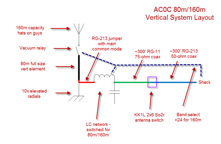 Adding topband to a full sized elevated 80m vertical and putting N6LF's QEX data to the test This antenna started out as an 80m vertical - with160m capability added as a secondary consideration. In reflection, I'm very glad to have added the 160m operation as that is a fascinating band. It's now on it's second version (v2), with a conversion from a trap-based to relay-based band selection and full matching net now complete.