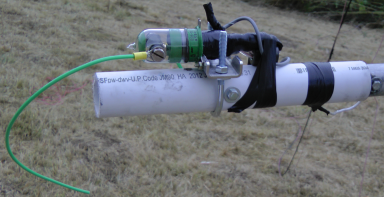 The top of the vertical has a bit of PVC mounted on the end; the relay is mounted to that. The PVC was left from the prior trap use and was convenient in that it provides some insulation function between the relay, vertical top, and the cap hat wires. The top-most guy wires are tied to the mast just below the PVC pipe (not visible in this photo). The gray colored control wire is visible here. It runs down the length of the vertical on the outside; taped in place every 10' or so. The cap hat wires are supported by the guy ropes by bits of electrical tape. Near the top of the vertical, the cap hat wires are tied together and taped onto the neck of the plastic bottle shown here.