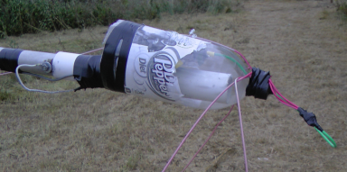 The wire lead from the relay extends out through a hole in the bottle top; the cap hat wires are joined at that point. The spacing from the cap hat wires and the top of the vertical is about 6" in total. The bottle also serves as a weather shield for the relay. The bottom of the bottle is taped shut to keep the wildlife from setting up home inside the bottle.