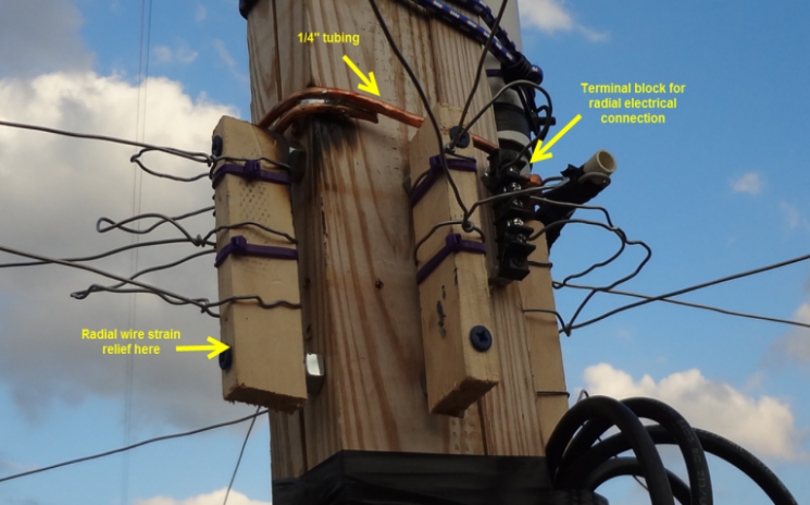 The key point of the elevated radial work done by N6LF makes clear that elevated radials can be very effective if you stay away from resonant values. Radial OptimizationThe radial support and connection method allows the radials to be disconnected individually for testing. The radials are tied to wooden blocks which serving a strain relief function. A few inches of radial form a loop and the end of the radial terminates into one of several terminal blocks. The terminal blocks are connected together with 1/4" copper tubing.. With elevated radials, it's important to try to make them as identical as possible to preserve an even current distribution over the various radials. Measuring the physical length is the normal method with the assumption that the other variations present among the radials (height, tension, lengths, etc) are not significant. However, measuring this seemed to me the better way to go. Measuring the radial currents for balance is difficult - there are 10 radials and a change in the length of one alters the current levels in all the others. So even if you had a method to measure all 10 radials simultaneously, I'm unclear as to what the procedure would be to even out the currents; perhaps the VNA could be configured to provide scan data on a deviation from average currents measured or something. In the end, I decided that measuring the currents would be best used as a confirmation of any trimming effort - not as the actual indicator for the trimming. Another suggestion (used here) was to disconnect all the radials, and then trim each radial so that the resonance points are identical. This allows adjusting the physical length and looking at the electrical result with an accurate instrument (VNA) which allows excellent precision. The idea is that once the radials are all connected, the currents will be evenly divided over the identically resonant radials. However, this method does assume that the resistive contribution of each radial is essentially the same. Specifically, the steps are: - Connect the VNA to the vertical and configure it to measure Xj.