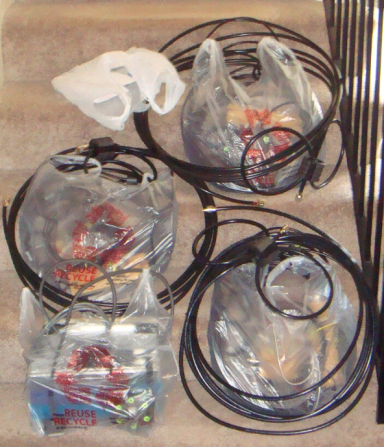 And here the beam kits are bagged and ready for transport to the attic. Would you like fries with that set of beams, sir? Initial Build ResultsThe east-beaming pair worked out beautifully. Interactions with the adjacent 15m director were less than the model predicted which (in this case) was a benefit. Very encouraging. The east-beaming DE looks like this: