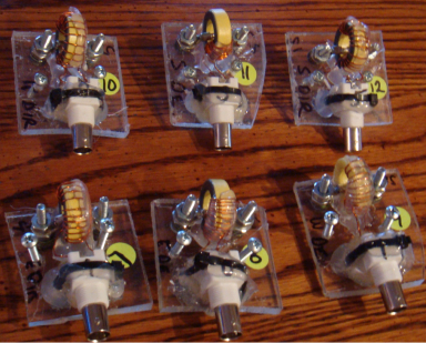 The RVM sensors were built on small scraps of 1/4" PS sheet. These are mounted on the wooden wire support and with their modular nature, allow for ease of removal, repair and calibration. Sensors are built from a T94-6 powdered core with 15 turns of 24 GA enameled wire. Prior sensors were built using type 43 cores which, at 10m, would have added a large series inductance with their presence. Heating was a factor as well and the large powered core should provide much better dissipation as well as much less of a lumped inductive component.