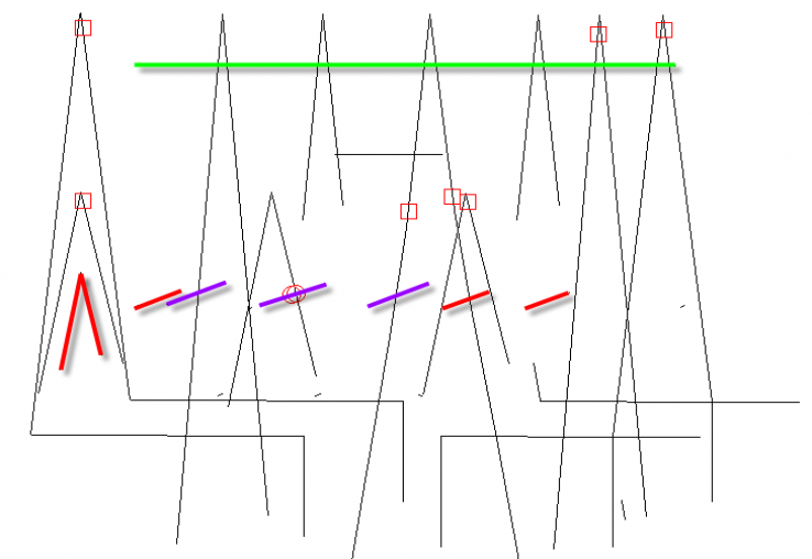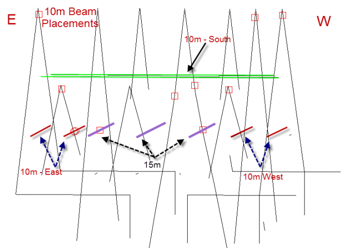 Unfortunately, Mr. Murphy made his appearance on the west beaming pair... I had made a mistake in the implementation - which was revealed when the resonant point of the west element DE (no director yet) was checked and found to be less than 20 ohms vs. a modeled 65 ohms or so. Uggg. The west wall stucco effect had come back to ruin my day. Read more about the stucco wall interaction problems HERE. Essentially, as the frequency is higher, the coupling effect associated with the stucco is much greater. In moving the DE away from the stucco wall, the effect is lessened but it turns out that about 6 feet of separation is needed to avoid working with single-digit resistance values! Unfortunately, that means a modification of the layout. And that means back to the model as a first step... Models - PART 2 Back on the drawing board... After a week or so of part-time model massaging, the final version of the 10m placement is shown below. Given the need to space the 10m away from the wall, and with a look to the future revision of the 15m antenna, and a re-trim of the 20m antenna, I converted the 15m and 20m antennas into 2-element reversible types. This is similar to the 3-element type except that what would normally be the reflector is simply broken by relay in the center leaving the single DE and director. And to accomplish this, some adjustment of the 10m east director into the inverted-v shape was needed. The 10m east and west beam pairs are shown in RED color below. Modifications to the 15m and 20m beams will be documented separately. Also, with further attention given to what would have been the south-beaming 10m array, it was converted to a single dipole element (green color) due to physical space constraints - adding the 2nd wire would have obscured the space available for movement and made future rafter climbing very difficult.