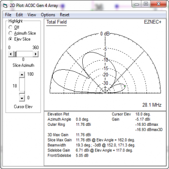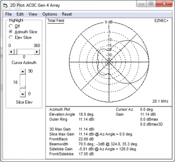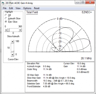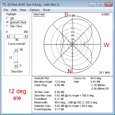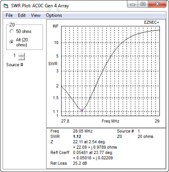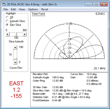 The model has tight coupling - running about 153 degrees of phase shift between director and driven element. And in the SWR plot, the effect is seen in a lowered feed-point resistance. Around 20-25 ohms at resonance. The modeled performance of the East beam inside the full model (with all other elements included) is: