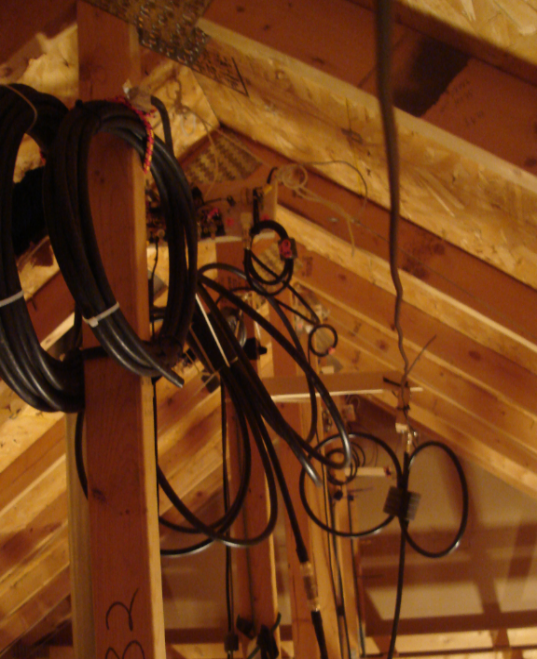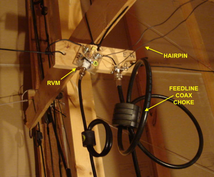 Here the N-S dipole can be seen running the length of the attic "boom." The coax coils left of the dipole are components of the 160/80/12m dipole.