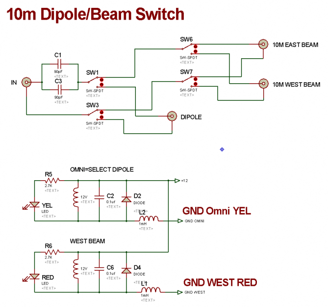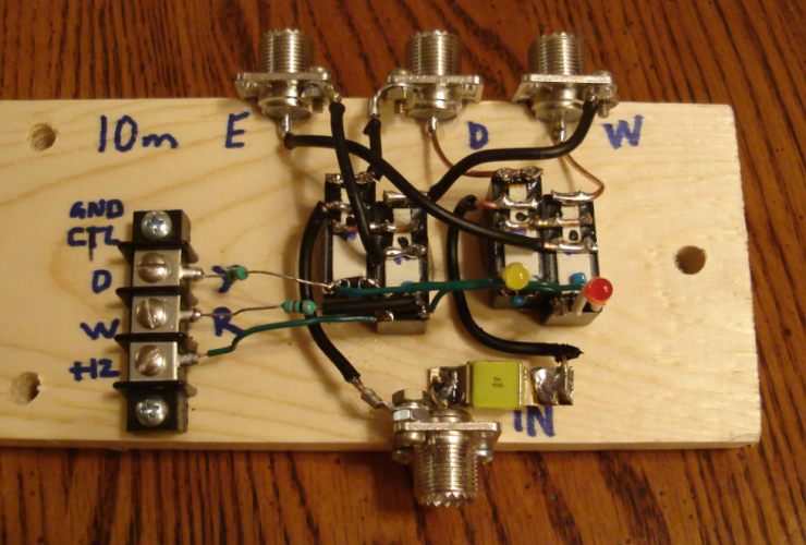 The small green squares are caps used to counter the inductance of the relays and interconnects. The two caps are slightly higher in value than ideal but produce acceptable SWR matches into a 50 ohm cal load of 1.06:1 (E), 1.12:1 (W) and 1.25:1 (D).