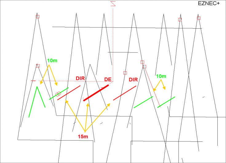 Encouraged with the results of the 10m array rebuild, next up on the overhaul list is the 15m beam. Design ChangesFundamental changes were to move the DE and west end director element a bit further away from the west end stucco wall. And to convert the prior 3-element (directory-DE-reflector) design into a 2-element (director-DE) type. The 3-to-2 element design further minimizes any performance impact from the parasitic effects that the west-side element will necessarily feel because of it's closer proximity to the stucco wall. The new 15m beam position (red color elements), and it's adjacent 10m elements (green color) are shown in the drawing here:
