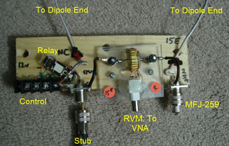 The control structure which facilitates the directional control is present on each director and has this circuit: Notice the inclusion of an extra SO239 for easy connection of the MFJ-259 for preliminary tuning. And the RVM sensor tap for phase magnitude/angle monitoring for use in fine-tuning the antenna - and verifying the operation of the stub/relay decoupling action on the up-next-for-modification 20m beam.