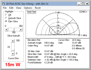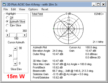 . ModelsEZNEC+ predicts the following characteristics for the azimuth and elevation. First beaming east, then beaming west. Compared to an "ideal" antenna (meaning a 2-element at the same height, over same ground), the gain looks good and F/B is acceptable. As with the 10m beam, it's hard to get a "clean" backside rejection with all the other wire around.