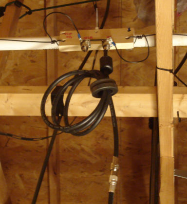 The mounting point for the dipole center was between rafters and I used a length of PVC to help support it. There is not much weight pulling on the assembly other than a length of coax. White PVC is generally a poor material for antenna construction because it's brittle in cold weather, can deform in higher temps and is subject to UV attack. But for attic work, these factors are less significant if the PVC is not put under sheer stress. The optional stub was not added at this time. The SWR is low and no further matching was needed. That also opens the door for potential use on 17/20m (with a tuner). One can never have too many antenna options...
