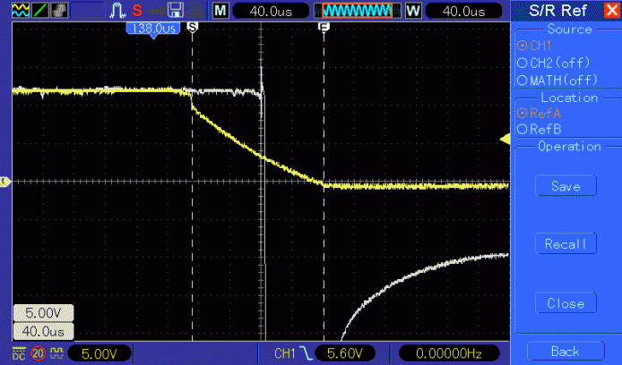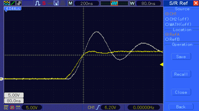 One more subsequent modification was made to accomidate the 15m OMNI mode required pulling the board one (hopefully) last time. The modification was a bit more complicated than I thought it would be at the outset. Including the the coax switching board, a total of 5 relays were needed. On the attic So2r controller, the relays (yellow boxed area) are enabled only when one rig has 15m selected, and then it routes the OMNI A/B line based on which rig is asserting 15m operation. See the 15m beam and dipole pages for more details. Sidebar: Taming Relay Induction Currents with a Snubber In this installation there are about 50 relays. And each time a relay is charged and discharged, the relay lines can serve as antennas for radiation of the spikes. By far the more troublesome of the two is the opening of the relay. When the connection to the supply is opened, the magnetic field collapses and a negative going spike many times the supply voltage can be induced. Typically a diode clamp is all that's needed to prevent the undershoot. In looking at various combinations of RC, the relays on this board responded very well to this snubber circuit.  The snubber components (inside the yellow ovals below) are mounted on right at the relay coil lead connections on the socket.  The white line shows the undamped relay line when engaged. The yellow line shows the impact of the RC. The slew rate is roughly the same but the severe overshoot is damped.