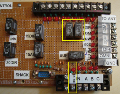 Build The board is built in a similar fashion to the main relay control board - a vector-board-style breadboard mounted on a wooden structure for strength and depth. Terminal blocks and the DB-15 allow for easy removal - the attic is a bad place to perform board repairs... The board is over-sized to allow room for some future idea if it comes up - and only 7 of the DB connector's 15 I/O are used. An unused relay socket is in place. And a dual set of 8-conductor cables has been run up to the attic from the shack - this board will utilize only one of the cables; leaving some spare capacity in place there as well. For the simplicity of the circuitry, the board is mechanically more complex than one would expect but this build style is helpful from a physical strength standpoint - and with the LED/labeling, easy to troubleshoot even after some months have passed and one has forgot what the configuration was initially. The LEDs are of a high brightness variety and will show some visible light when exposed to RF on the supply leads. This has turned out to be a very convenient assistant for identifying RF on the control lines as the attic lighting is turned out, the rig + amp is keyed with the help of an assistant - and then I look for which of the LEDs are lighting. Adjustments in the wiring or ferrite chokes is made until the LEDs no longer show visible light. This does not address common mode "board level" bounce overall but it's proven to be a workable solution in the context.