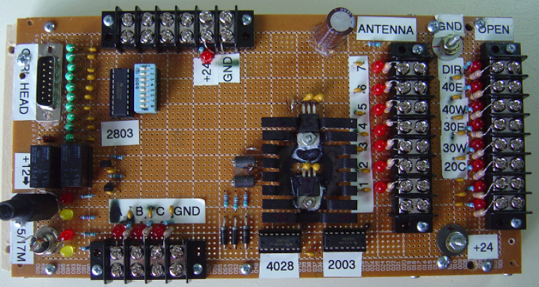 The switching module decodes these inputs and switches the relays to the correct positions. The power supply is fused on both the primary and secondary side. RF bypassed on both sides. All lines into and out of the module are bypassed by 200 mH inductors and 0.1 uF caps in an L network. No RFI effects have been observed to date. The terminal strips allow easy connection of the various lines running to the relay and power lines. A DB15 connects the lines from the control heads. IC content of the board is minimal - a BCD decoder and relay driver arrays. The heat sinks as shown here are inadequate and need to be replaced or supplemented. The LEDs adjacent to each connection help in diagnostics and confirm which lines are active . To facilitate diagnostics,a jack on the board connects to a remote push-button switch to allow local override and switching of the antenna direction and 15/17m lines. A DIP switch allows selection of open/short combinations.